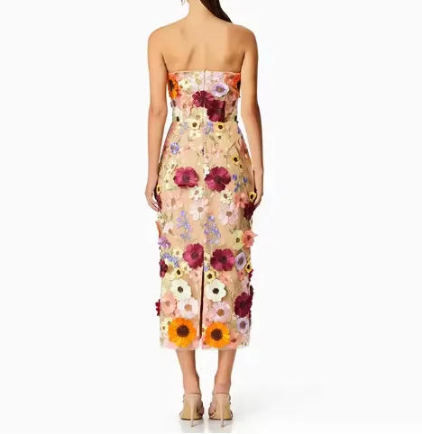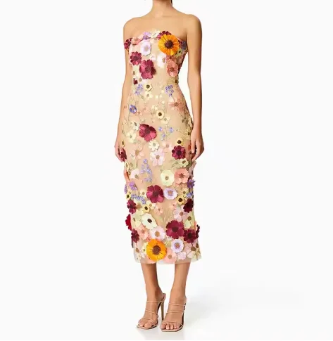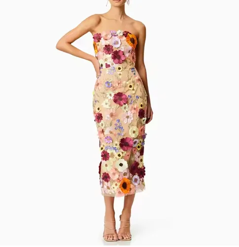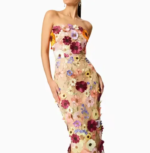 Luxury Women's High-Waisted Dress Multi-Color Slim-Fit Patchwork 3D Applique Strapless Sleeveless Design Lace Made Spandex